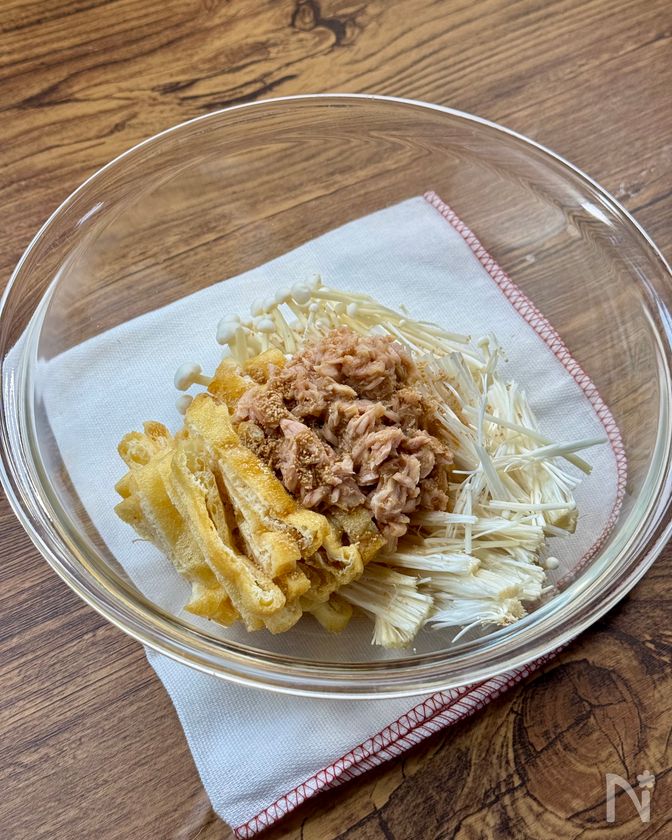 (1) 耐熱容器にえのきと油揚げを入れ、ツナ缶(油漬け)はオイルごと加える。ポン酢と和風顆粒だしを加える。