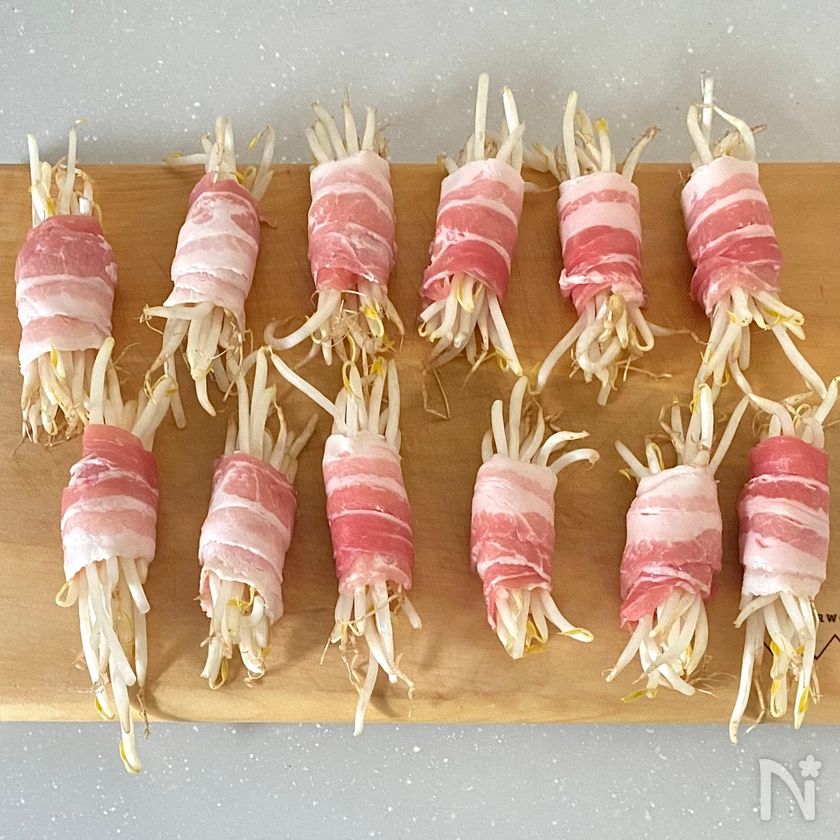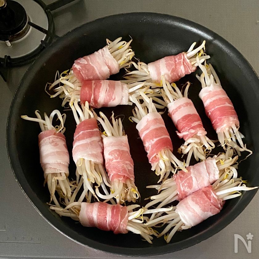 (2) さっと水洗いして水気を切ったもやしを、豚バラ薄切り肉で巻く。