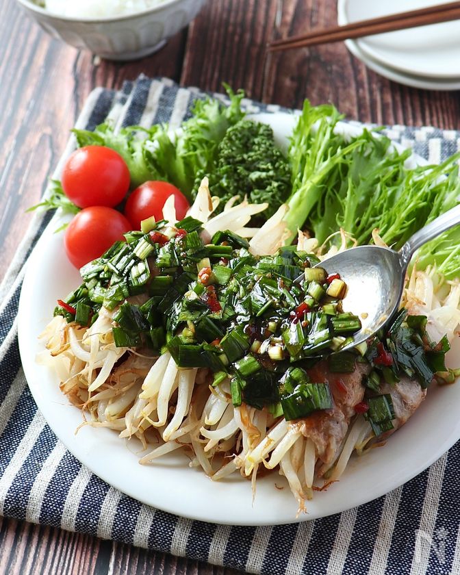 (4) お皿に盛り、ニラの香味たれをたっぷり乗せる。