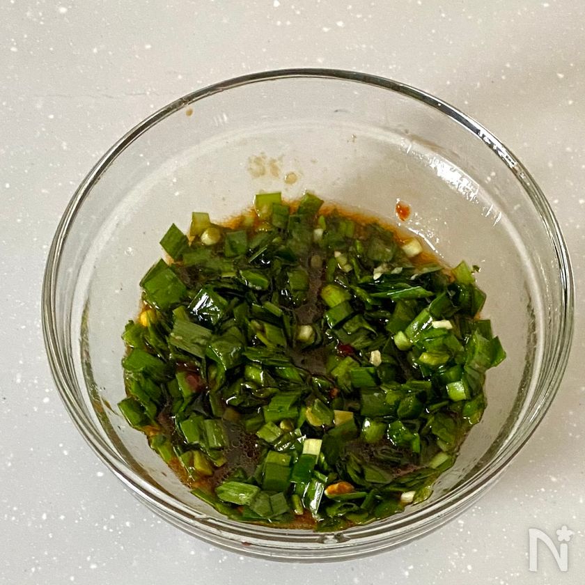 (1) ニラは1cm幅に切り【A】としっかり混ぜ合わせてしばらく置いて馴染ませる。