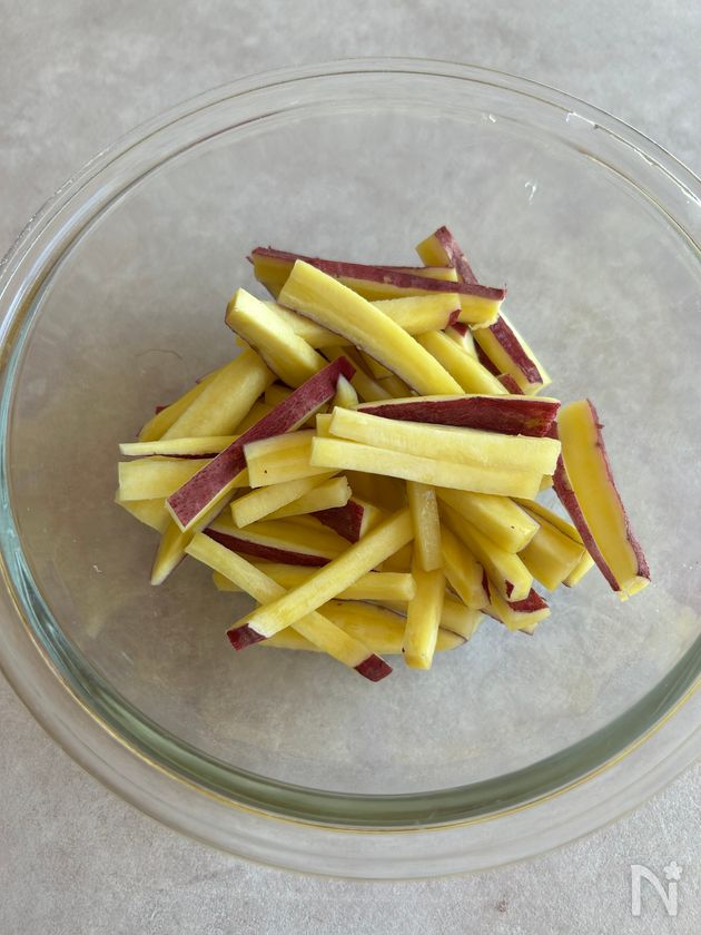 (2) さつまいもは皮つきのまま細切りにし、5分ほど水にさらす。耐熱ボウルに入れてふんわりラップをし、電子レンジ(600W)で3分ほど加熱し、粗熱をとる。