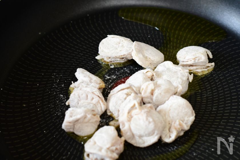 (2) フライパンにサラダ油を熱し、①を炒める。色付いたら取り出す。