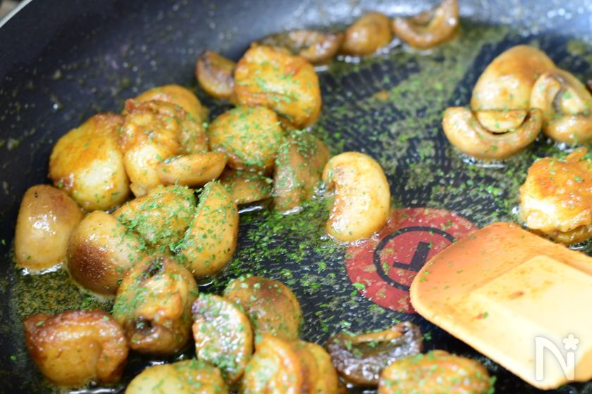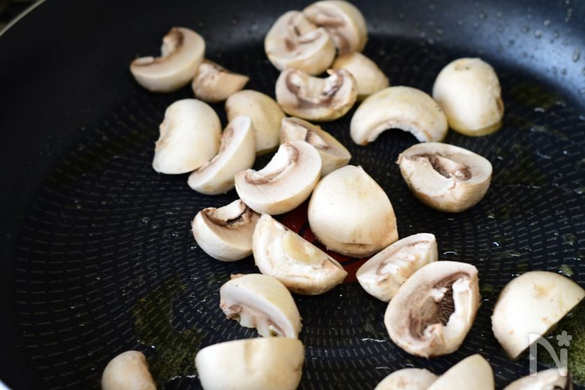 (3) 同じフライパンに、半分にカットしたマッシュルームを入れ炒める。