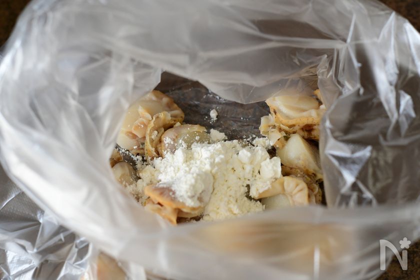 (1) 綺麗なビニール袋に、ベビーほたて(蒸し)、薄力粉を入れ口を閉じて振る。