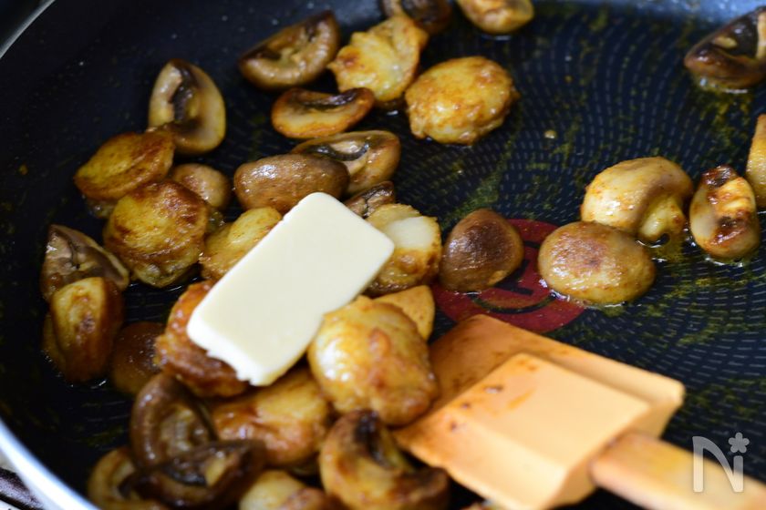 (4) ②を戻し入れ、【A】で調味し、バターを加える。