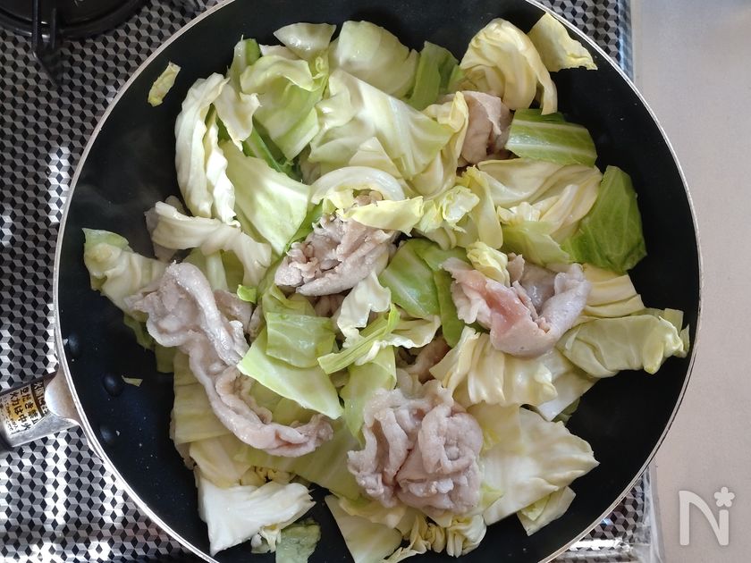 (3) 豚肉の上にキャベツを適当な大きさにちぎってのせたら中火にかける。