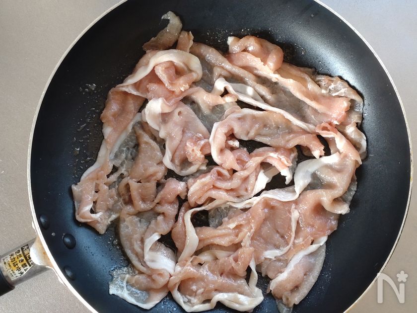 (4) ジュージュー音がしてきたら豚肉を裏返し、炒める。