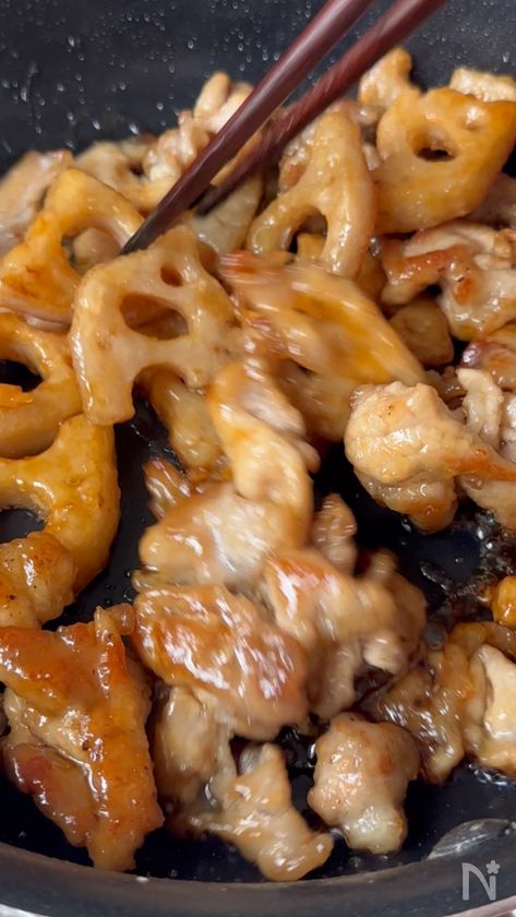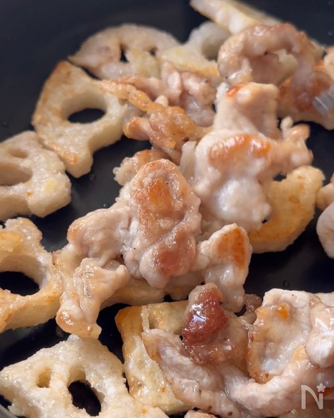・豚こま肉とれんこんに片栗粉をまぶしてから揚げ焼きにすることで、たれがよく絡みます