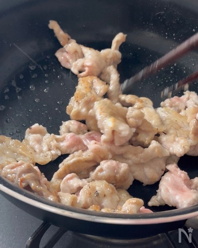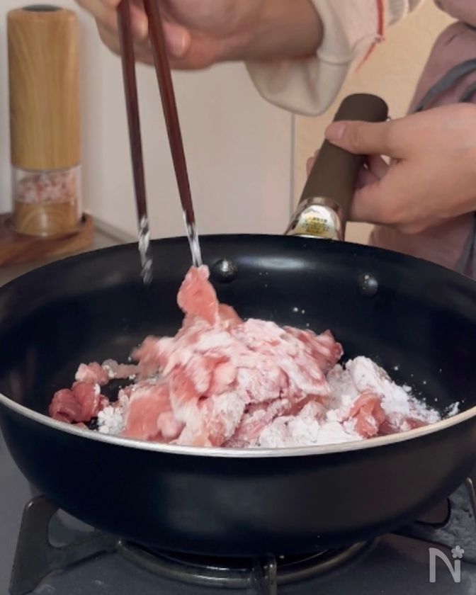(3) 冷たいフライパンに豚こま切れ肉、塩こしょう、片栗粉(大さじ1)を入れ、全体にまぶす
