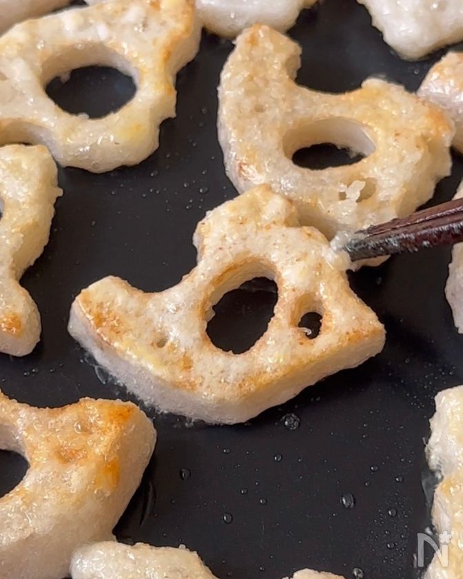 (5) お肉を皿に取り出し、サラダ油(大さじ3)れんこんを入れる。両面焼き目がつくまで中火で揚げ焼きする。