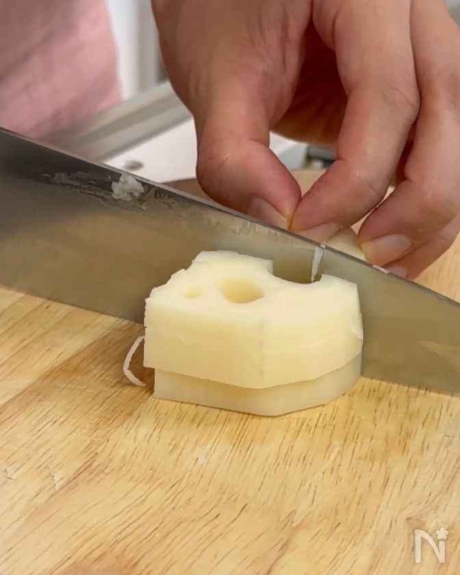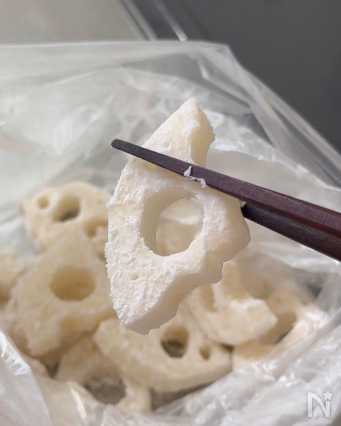(2) れんこんをポリ袋に入れ、片栗粉(大さじ1)をまぶす。