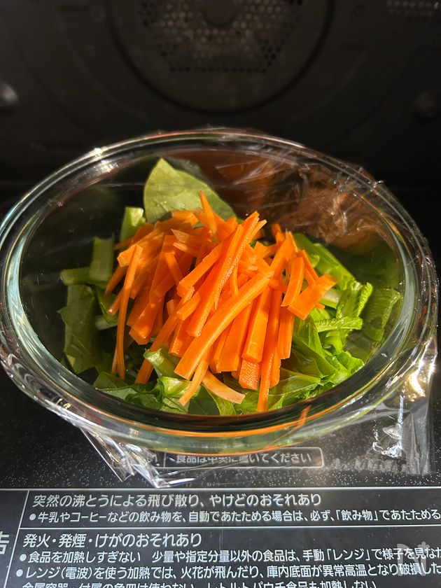 (2) 小松菜は洗って3cm幅に切り、にんじんは細切りにする。耐熱ボウルに入れてラップをし、600wの電子レンジで2分ほど加熱する。冷水にさらして、水気を絞る。