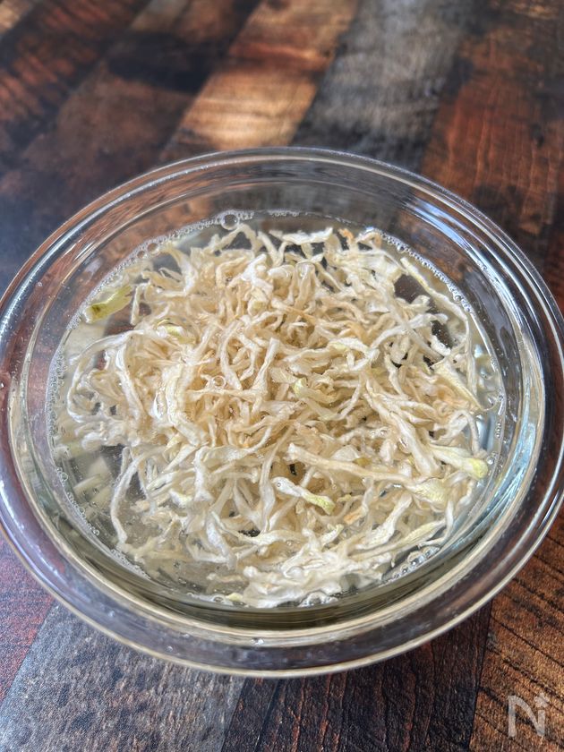 (1) 切り干し大根は水でもみ洗いし、そのまま水で戻して水気をよく絞る。