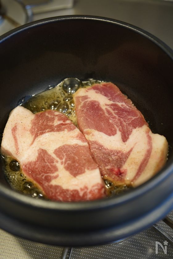 (下準備) 豚バラ肉に塩、胡椒を振る。