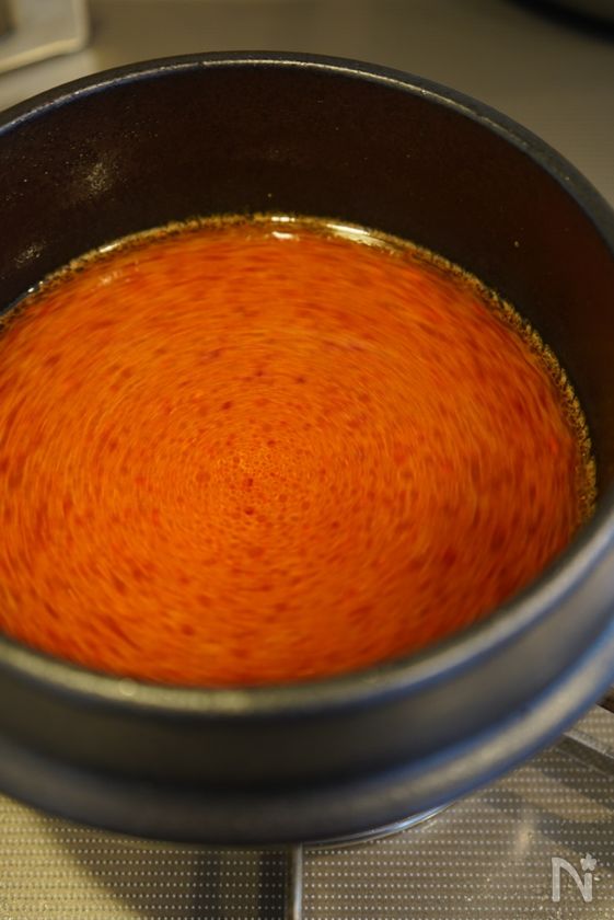 (3) ②に豚バラ肉、キムチ、卵を落とし入れてねぎを散らし、仕上げに韓国唐辛子(分量外)をトッピングする。