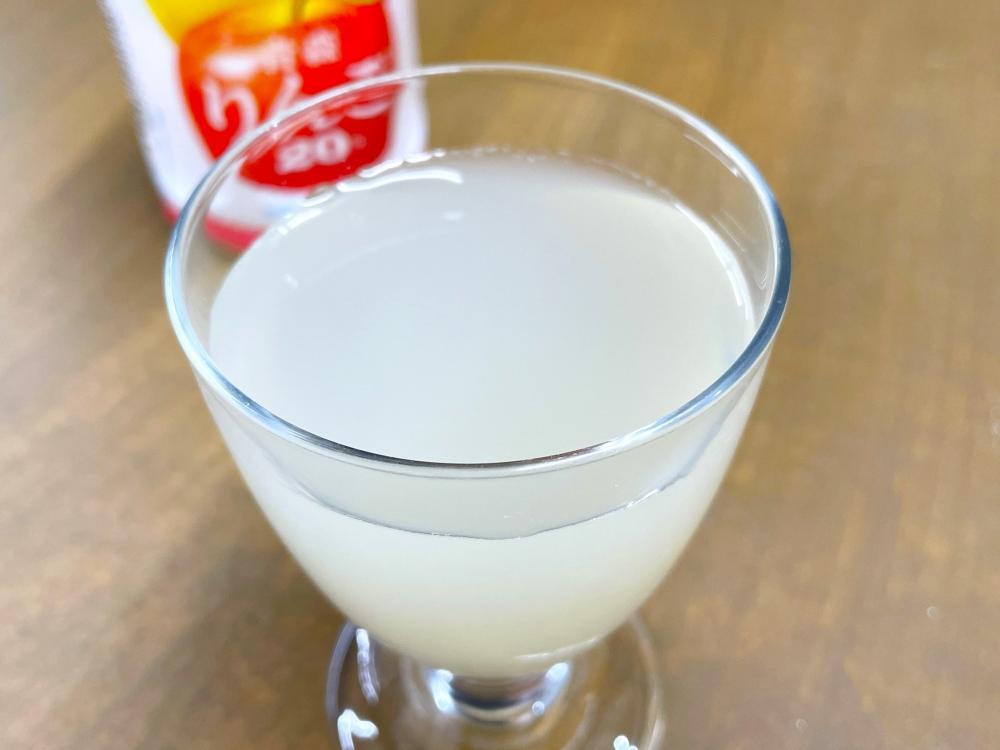 これまでの果汁100%ジュースと比べると、若干白みが強い印象。透明感がありながら濁りも見られ、これは本物の証です。