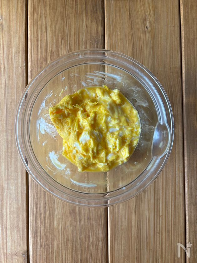 (2) 中火で熱したフライパンにサラダ油を引き、溶き卵を加えて半熟状態になるまで炒め、一度取り出す。