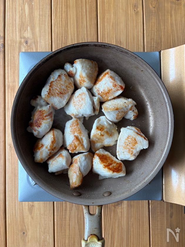 フライパンを再度中火で熱し、鶏むね肉を加えて4~5分焼く。