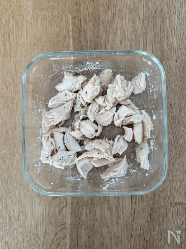 耐熱容器に入れ、ラップをして、電子レンジ(600w)で、2分30秒~3分加熱する。粗熱をとり、さいて、余っているゆで汁につけておく。