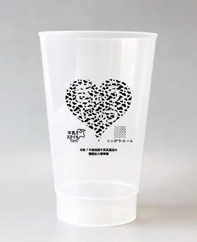 配布カップには、牛の斑点をハートに見立てたデザインが描かれています。また、牛乳を注ぐと「ぎゅうにゅう」の文字が浮かび上がるハートフルな仕掛けにも注目です。