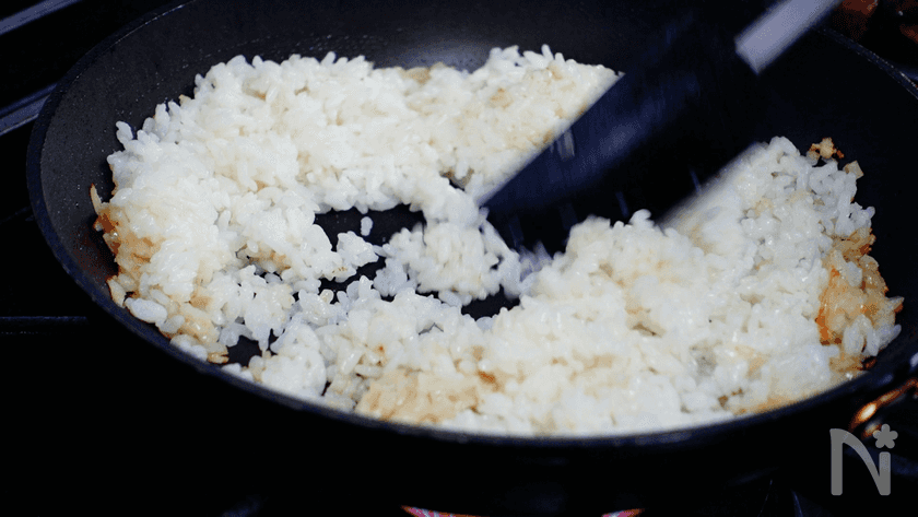 (9) 玉ねぎが透き通ってきたら、バターライスを加え、ヘラなどで切るようにほぐしていく。塩 ひとつまみと粗挽き胡椒をしてさらに炒める。