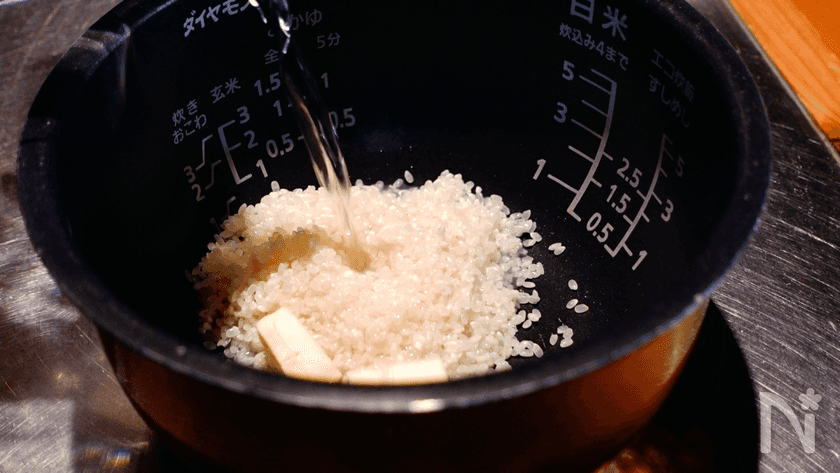 工程1)バターライスは水をすこし少なめに炊くと、いい感じのパラパラに仕上がります。