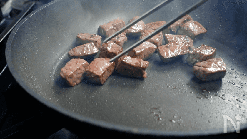 (6) フライパンは洗わず、牛肉を入れ強火にかける。塩 ひとつまみ、粗挽き胡椒 少々をし、全面に焼き目を付けるように炒める。全面に焼き目が付いたら取り出す。