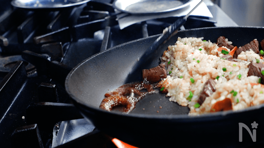 工程10)いったん取り出しておいた肉を炒めたごはんに戻す際は、肉から出た肉汁は旨味になるため一緒に加えます。