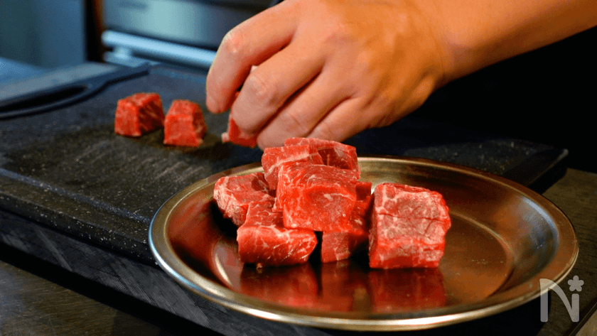 (2) 好みの牛ステーキ肉を、一口大の食べやすいサイコロ型に切る。