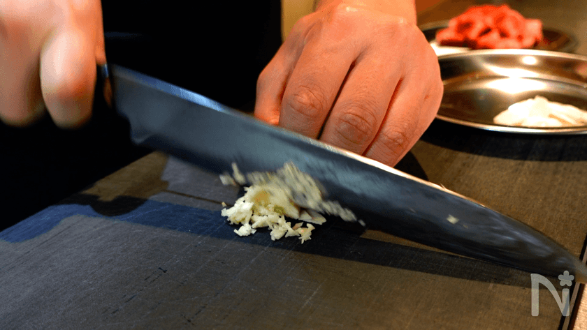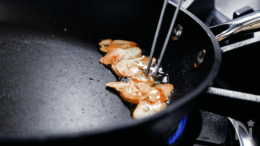 工程5)にんにくチップは余熱で火が入るため、すこし早めに取り出すのがポイント。