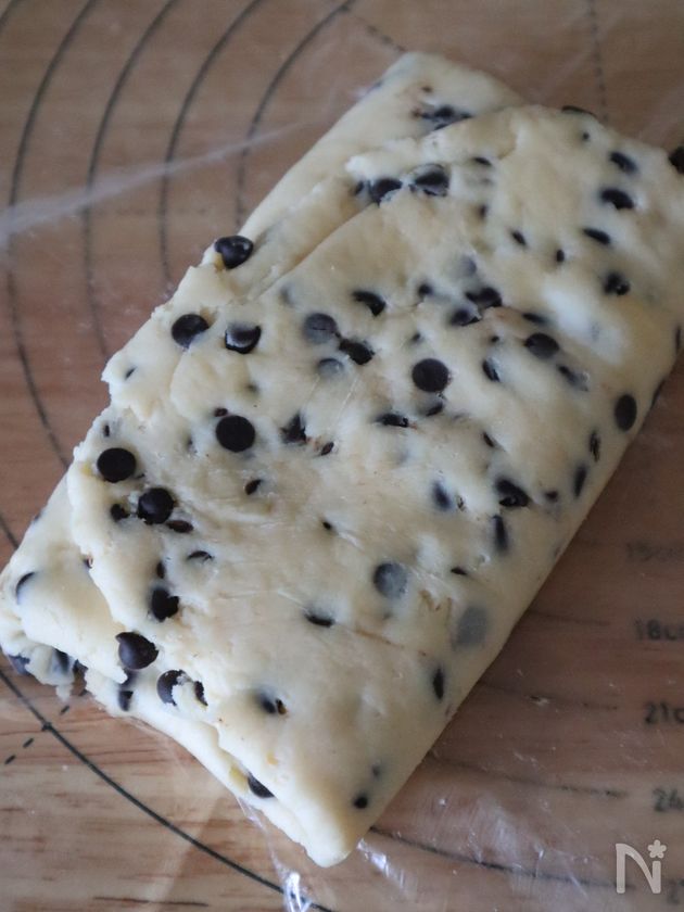 材料にチョコチップ100gを追加、作り方3の最後に加える。