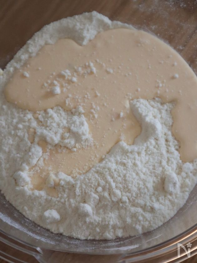 ボウルに粉類(強力粉、薄力粉、粉糖、粗塩、ベーキングパウダー)を入れて泡立て器で全体を混ぜ、冷やしたバターを入れてスケッパーなどで切るように混ぜる。ある程度混ざったら手でこすり合わせるように粉とバターをしっかりと混ぜる。