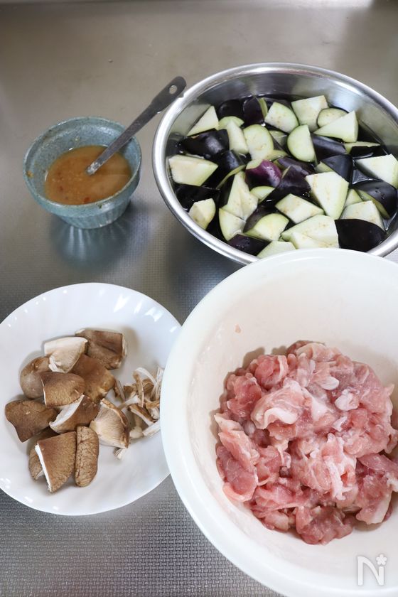 (1) 豚こま切れ肉に【A】を揉み込む。茄子は乱切りにし、水に5分ほどさらしておく。椎茸はかさを十字の4等分に切り、軸は石突きをとって割く。