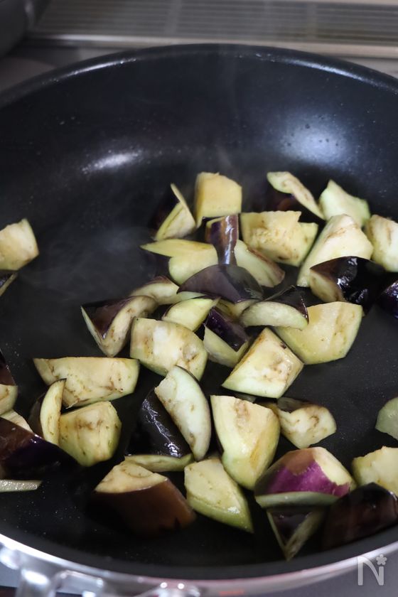 (2) フライパンにごま油をひき、水気を切った茄子を中火で炒める。