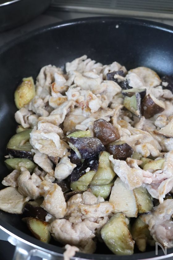 (3) 茄子に火が通ったら、豚肉と椎茸を入れて肉の色が変わるまで炒める。