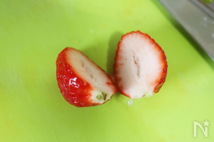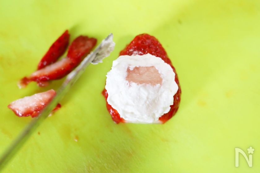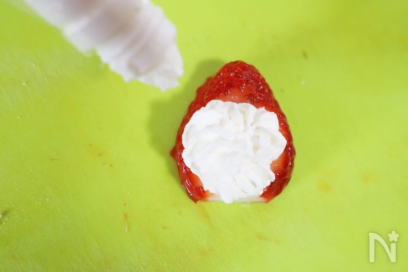 (5) 【苺サンタの作り方】苺を縦半分に切る。
