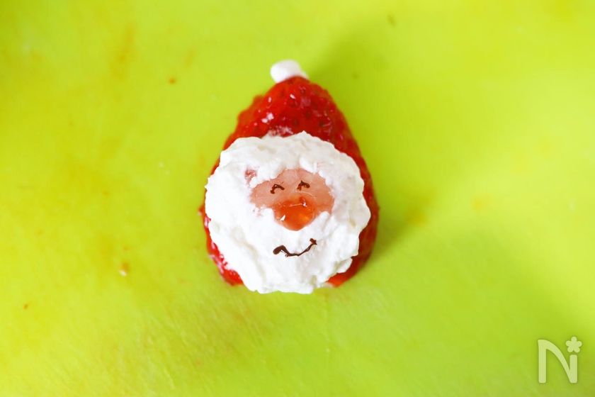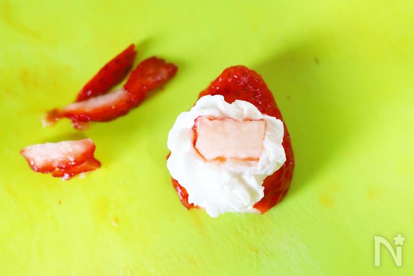 (8) 苺の中の白い部分を長方形に小さく切って、クリームに軽く押しつけるようにしてつける。(サンタの顔の部分になります。)