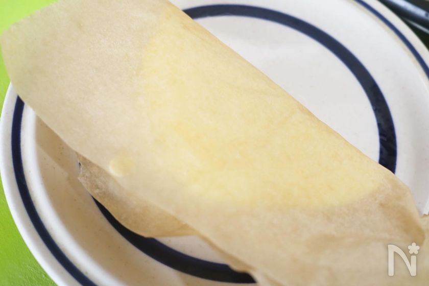 (4) 600Wのレンジで1分〜1分半加熱したら、熱いうちにクッキングシートごと半分に折りたたんでそのまま冷ます。(加熱しすぎると生地が固くなるため、注意)