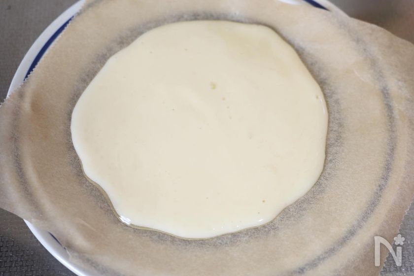 (3) 耐熱皿にクッキングシートを敷き、②の生地を少量ずつとって丸く伸ばす。(だいたい直径12cm程度)