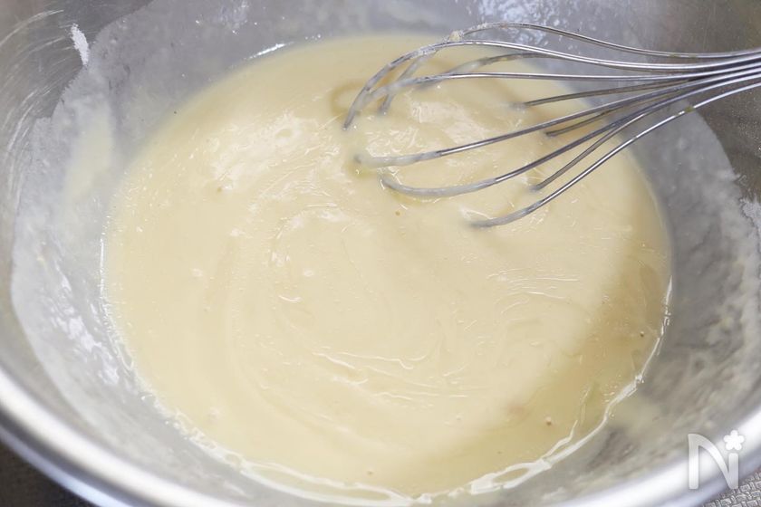 (2) ①に米粉、砂糖、ベーキングパウダー、牛乳を入れてよく混ぜ、サラダ油を加えて混ぜて馴染ませる。
