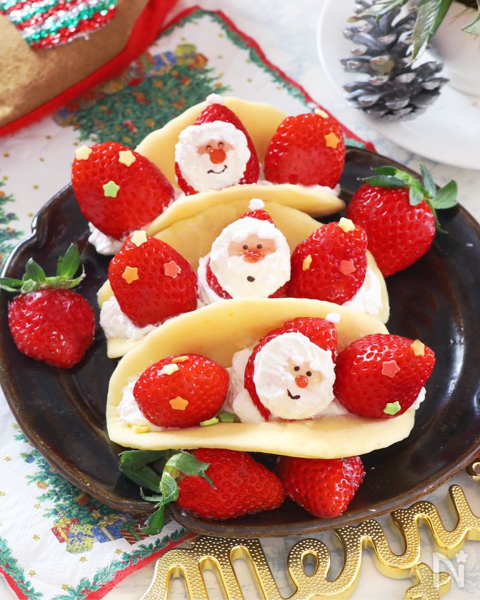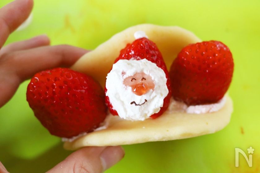 (11) ④のオムレットにホイップクリームを絞り、苺や⑩の苺サンタをサンドする。