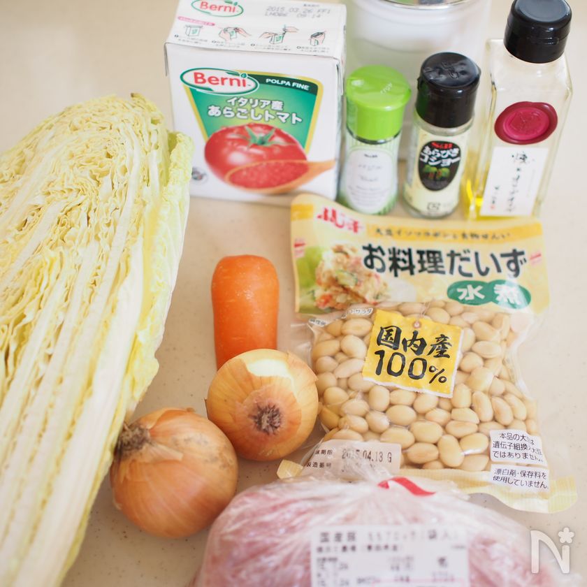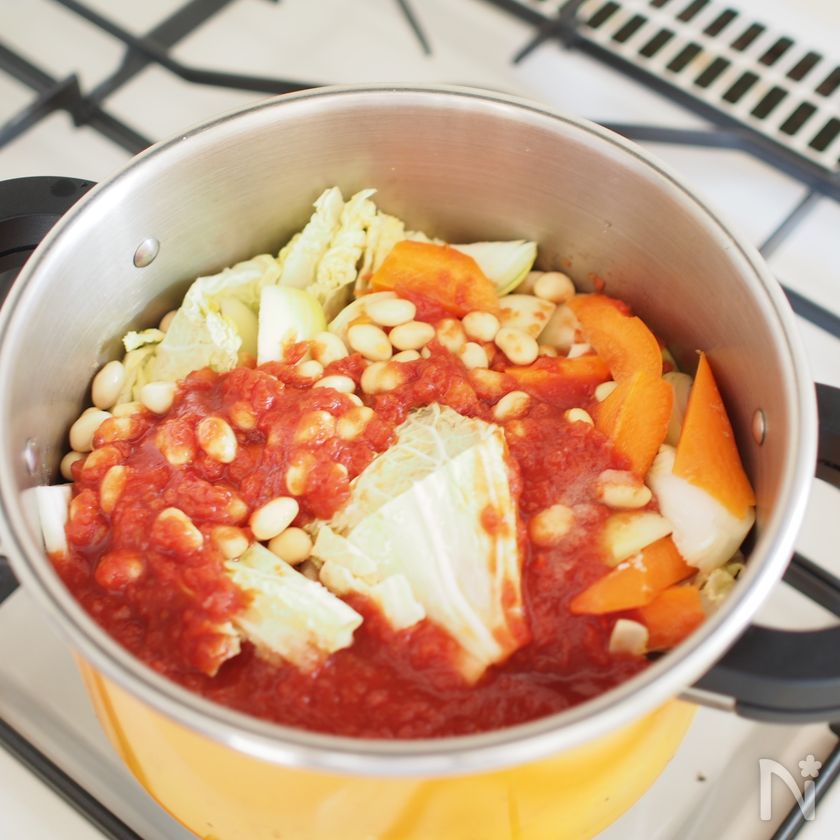 (2) ざく切りにした白菜・人参・玉ねぎ、水煮大豆・トマト水煮と