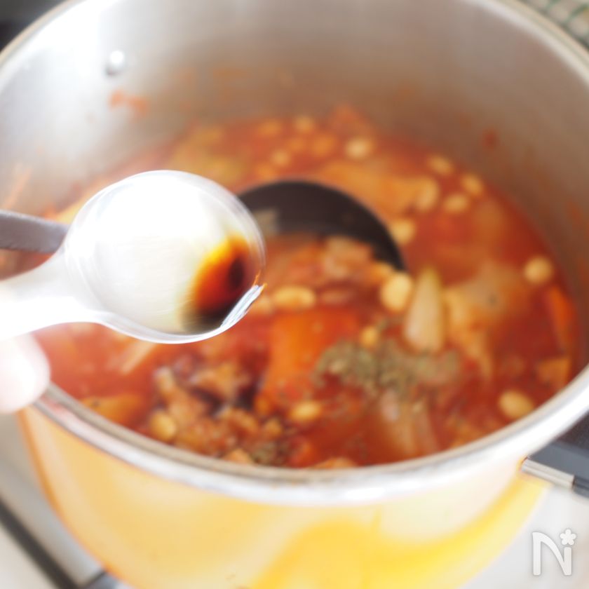 (3) 圧力が抜けたら蓋をあけ、塩コショウ・砂糖・ドライバジルで味を調え