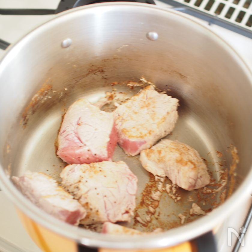 熱した圧力鍋にオリーブオイルをひき、お肉の表面の色が変わる程度に