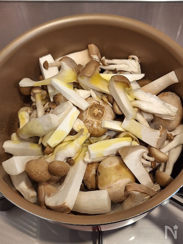 (2) フライパンまたは鍋にオリーブオイル大さじ1を熱し、きのこ類を入れて上からオリーブオイル大さじ1をかけて混ぜ合わせる。