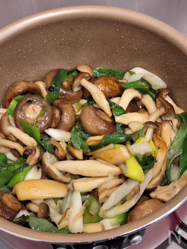 (3) きのこのかさが減って焼き色がついたら長ねぎと【A】を加えて混ぜ合わせ、長ねぎが柔らかくなるまで加熱する。