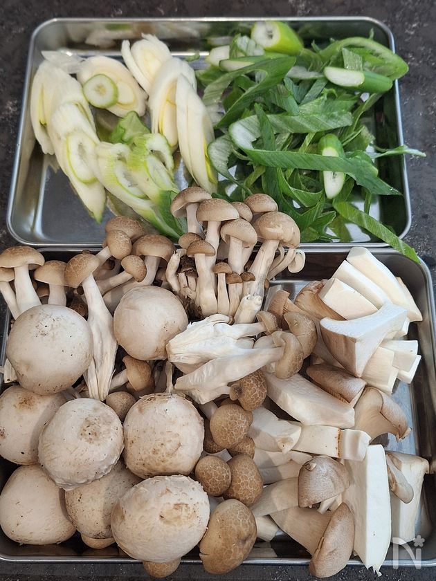 (1) 長ねぎは斜め薄切り、きのこ類は石づきをとる。