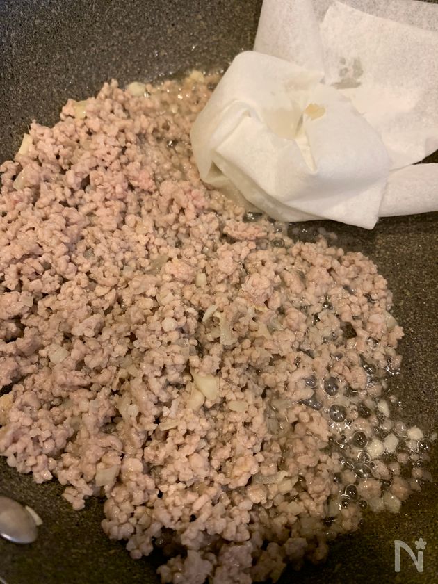 (1) フライパンに、にんにく、生姜、サラダ油を入れて火をつけ、香りが出てきたら豚ひき肉を入れて炒める。