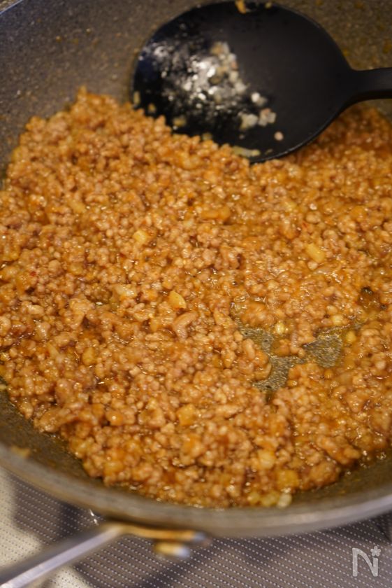 (2) ①に【A】を入れて水分が少なくなるまで炒める。肉味噌の完成。