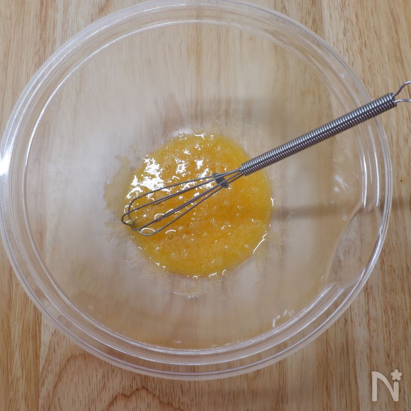 (1) ボールに卵とグラニュー糖をいれて溶かすように混ぜ合わせる。(泡立てる必要はありません)